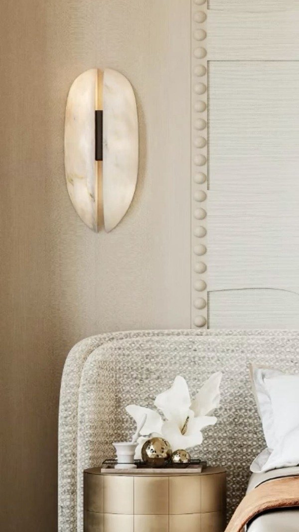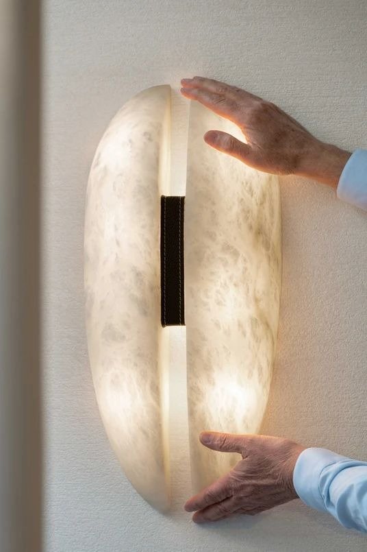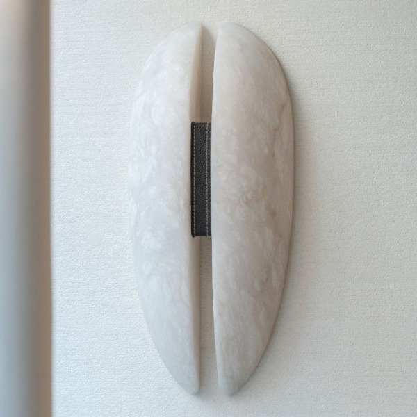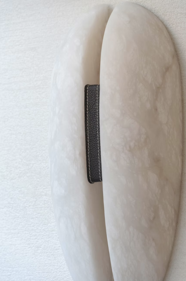 El KAYA es un aplique de pared único que combina la elegancia del mármol natural con la textura refinada del cuero, logrando una pieza decorativa de gran impacto visual. Su diseño ovalado con un delicado detalle central en acabado negro aporta modernidad y estilo, mientras que la luz LED 2700K envuelve el espacio con una calidez acogedora.