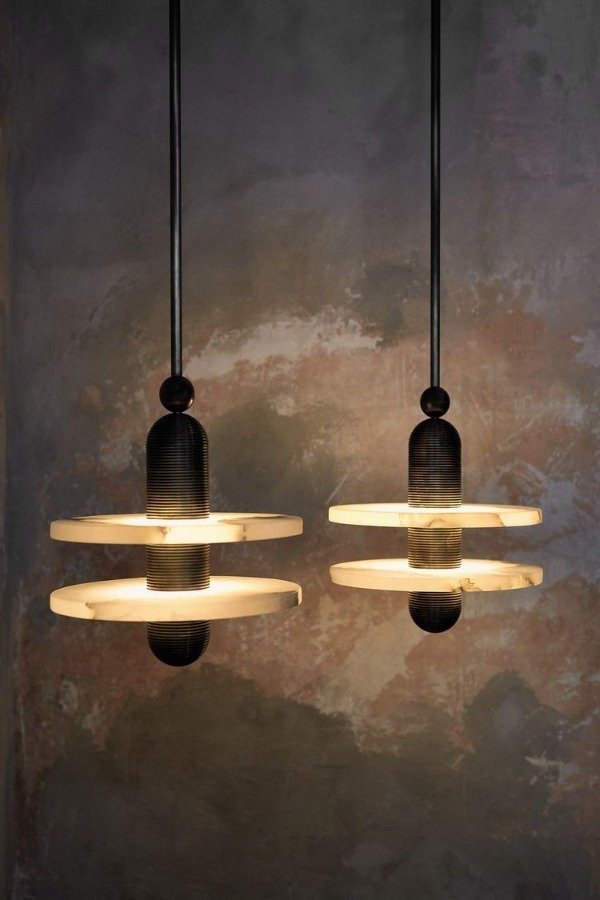 La colección TUNS destaca por su diseño minimalista y sofisticado, elaborado en alabastro natural combinado con metal en acabado negro. Sus discos superpuestos en dos capas generan un efecto visual único y difunden la luz LED 2700K de manera cálida y acogedora, ideal para espacios modernos y elegantes.