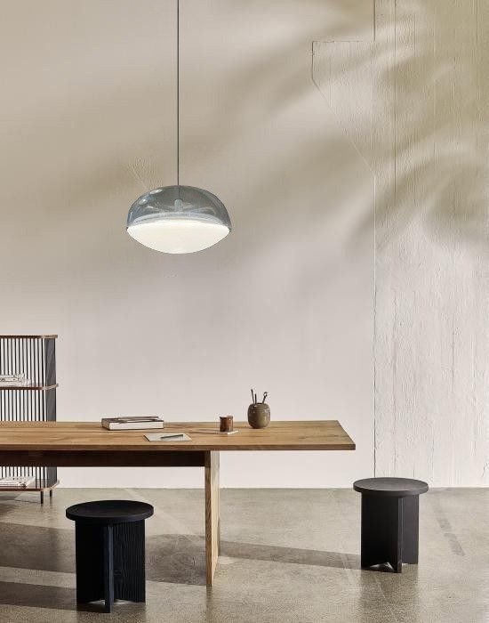 La serie CRETA se caracteriza por su diseño minimalista y sofisticado, con pantallas de vidrio soplado en combinación con detalles en hierro, logrando un estilo elegante y contemporáneo.