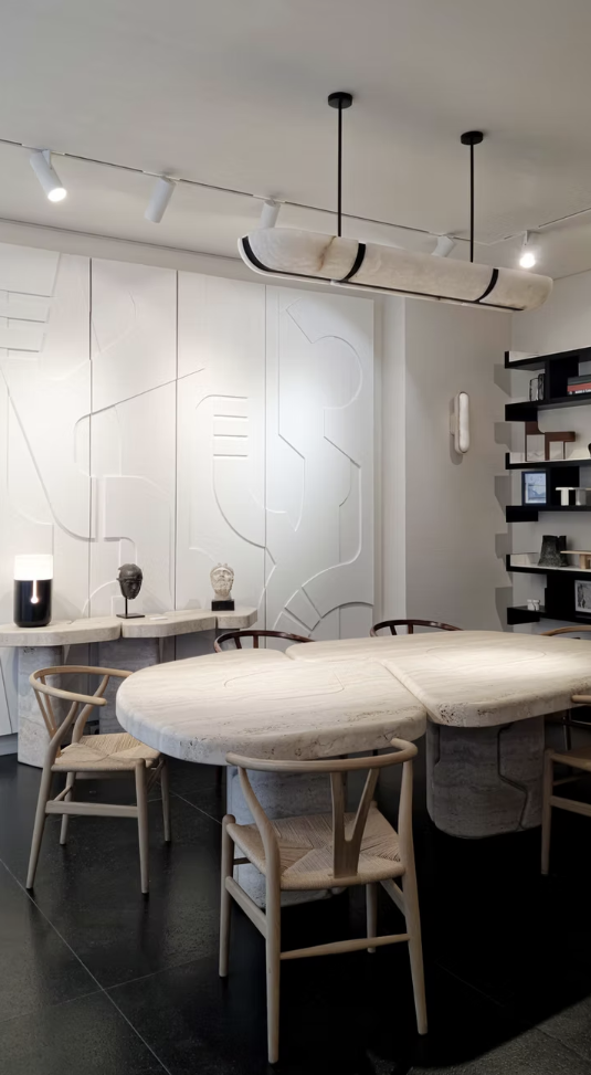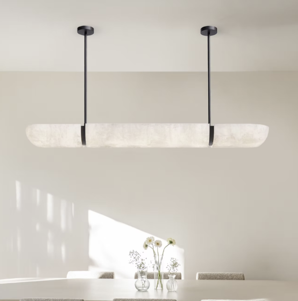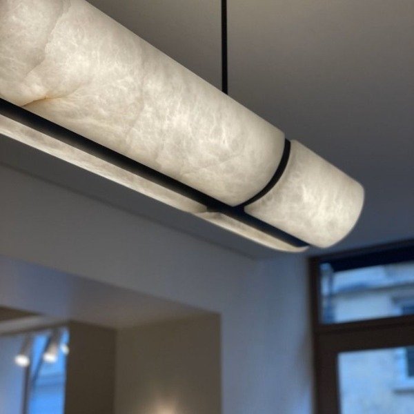 La lámpara colgante EDIRNE combina diseño escultórico con materiales nobles para lograr una pieza elegante y funcional. Su cuerpo alargado de mármol suspendido por estructuras de cobre negro la convierte en una elección ideal para espacios amplios y modernos.