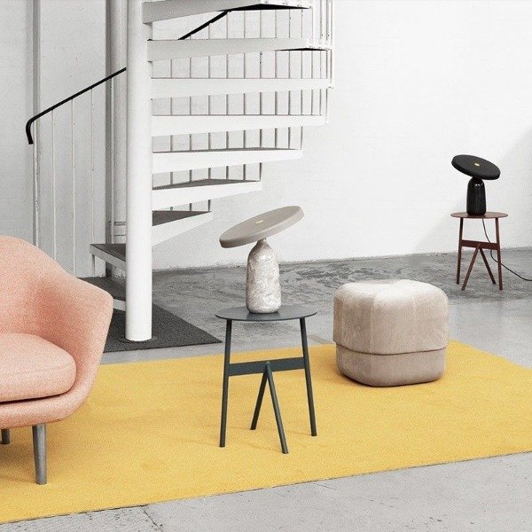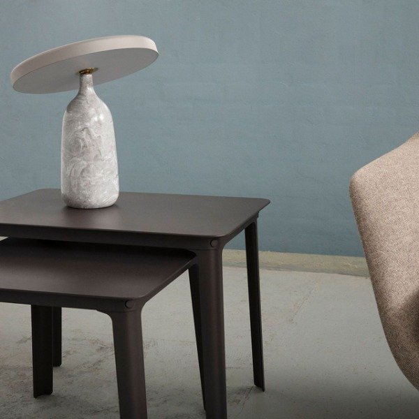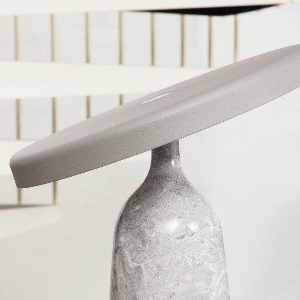 El diseño de la KUME se inspira en la simplicidad y el equilibrio de las formas naturales. Su base, tallada en alabastro, irradia una luz suave y difusa que resalta las vetas y texturas únicas de la piedra, mientras que la parte superior metálica —ligeramente inclinada— funciona como pantalla y elemento escultórico.