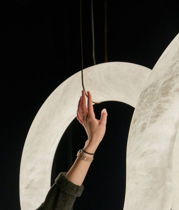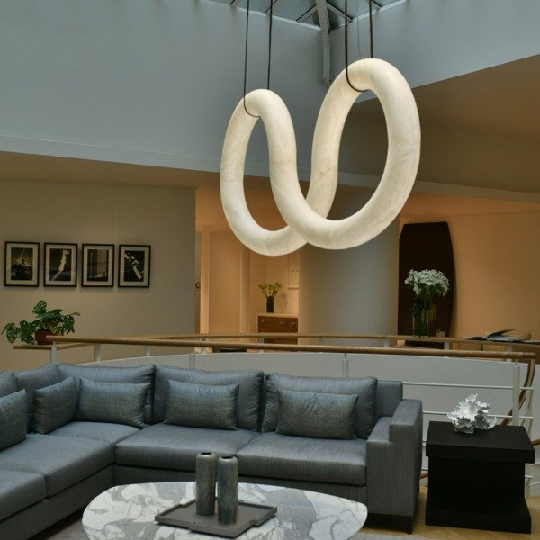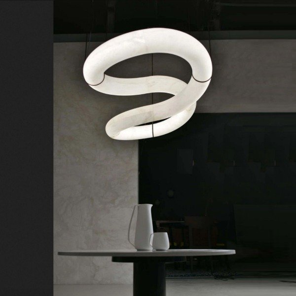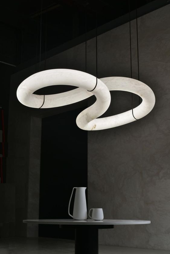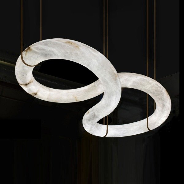 Ilumina tus espacios con una pieza de arte moderna. Combina elegancia y movimiento en un diseño escultórico de alabastro que parece flotar en el aire. Su forma entrelazada crea un efecto visual único, proyectando una luz suave y envolvente ideal para salones, comedores o espacios de diseño contemporáneo.