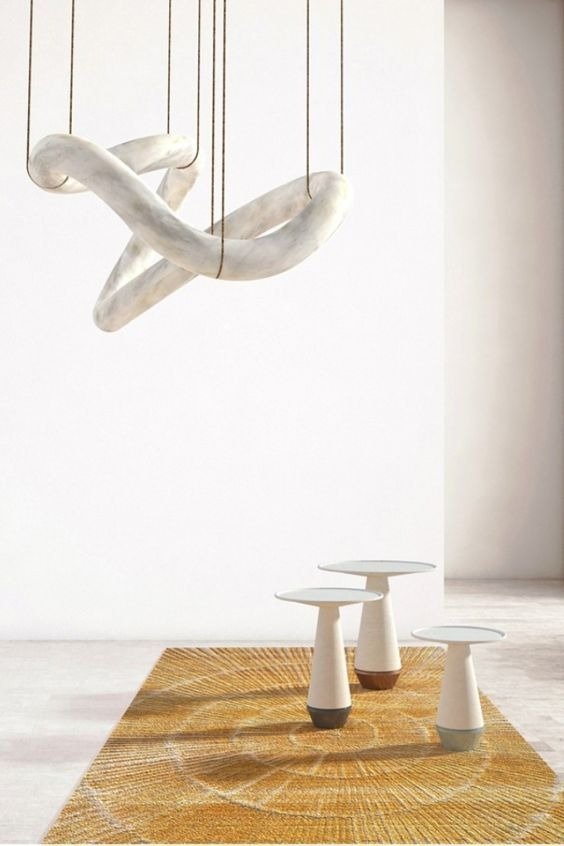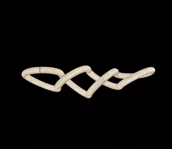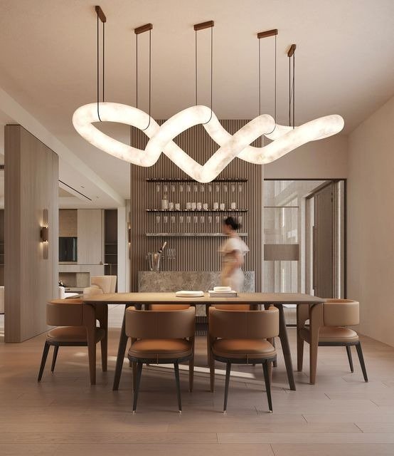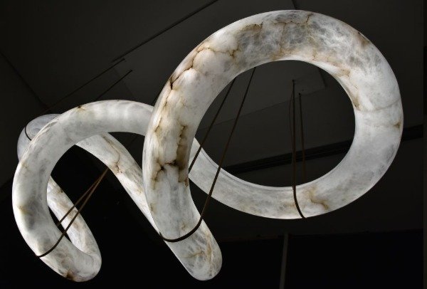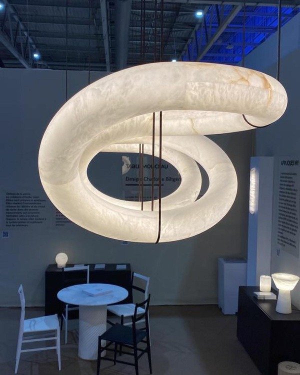 Transforma tus espacios con esta impresionante lámpara colgante, una pieza que combina diseño artístico y materiales de lujo. Su estructura sinuosa de alabastro natural se integra con detalles en hardware metálico negro, creando un contraste sofisticado y contemporáneo.