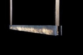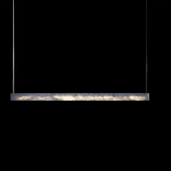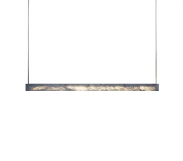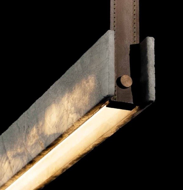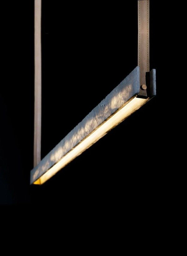 La SUMATRA es una pieza que combina diseño contemporáneo y materiales nobles. Su estructura lineal de alabastro natural y metal, suspendida mediante elegantes correas de cuero, crea una presencia cálida, moderna y perfectamente equilibrada.